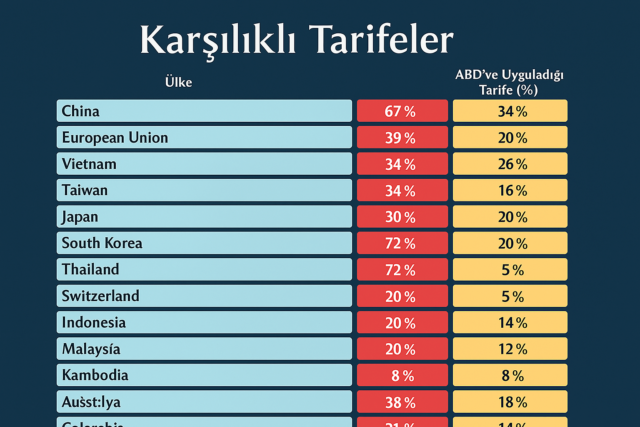 ABD Başkanı Donald Trump’ın liderliğindeki yönetim, karşılıklı gümrük tarifeleri listesini kamuoyuna duyurdu. “Reciprocal Tariffs” olarak adlandırılan bu politikada, ABD’ye ithalat yapan ve yüksek oranlarda tarife uygulayan ülkelere benzer oranlarda karşılık verileceği belirtildi.